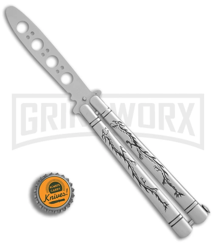 The Andux Tarragon Trainer offers a sturdy design and a dull blade for safely practicing your favorite balisong tricks. The handle is made from stainless steel with a dragon etching and a spring latch. It has a dull trainer blade made from 420 stainless steel with a dual tang pin design. Item includes a nylon belt sheath.