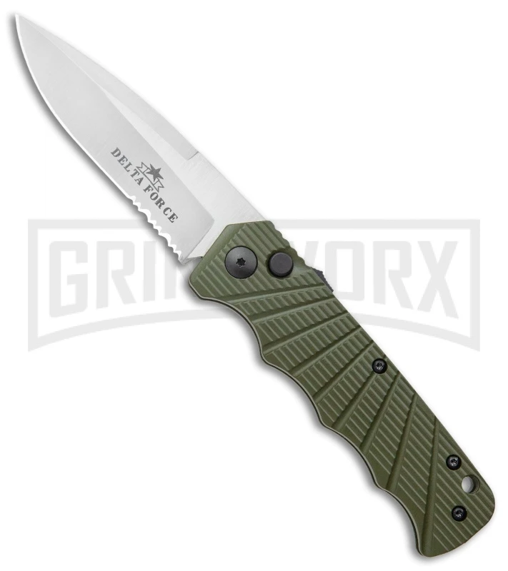 Delta Force Automatic Knife Green Aluminum - Satin Partially Serrated