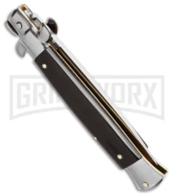 This is an awesome stiletto. It’s a massive 11″ when open. The handle features beautiful creamy camel bone with brass liners. The dagger blade is stainless steel. The knife fires hard, and there is a safety to prevent accidental opening. Tang is stamped “Frank B.”