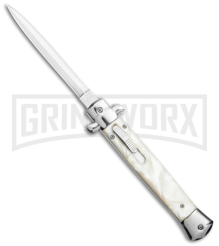 This Mago OTF model features a satin finished dagger blade and a white marble acrylic handle.