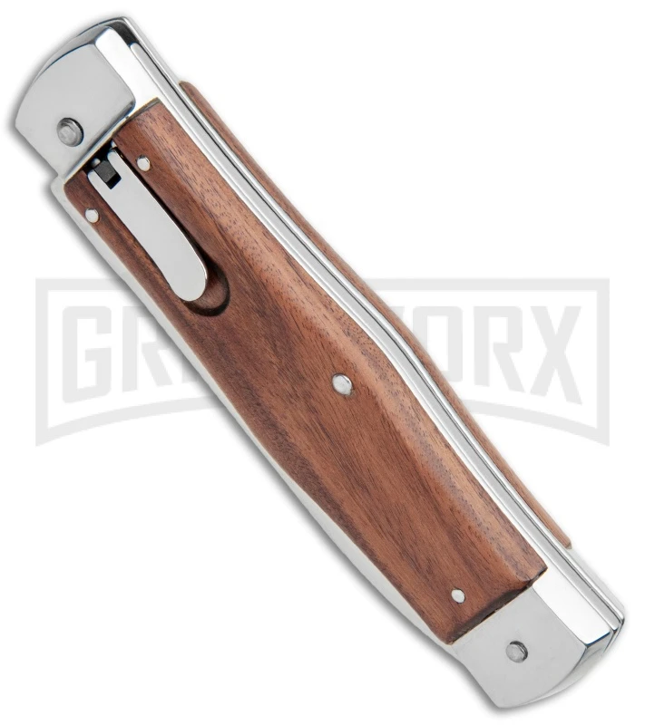 The Mikov automatic knives come from the Czech Republic. This model features wood scales with double bolsters and a dagger-style stainless blade (one side is sharp and the other is a false edge). The Mikov series is well-regarded for their “ready to work” no nonsense design. Rivet construction. The knife is opened using the small lever near the top of the knife. The lever rests flush in the handle when not in use.