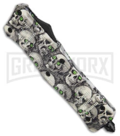 This model features a gray carbon fiber handle with a black, white, and red skull pattern.